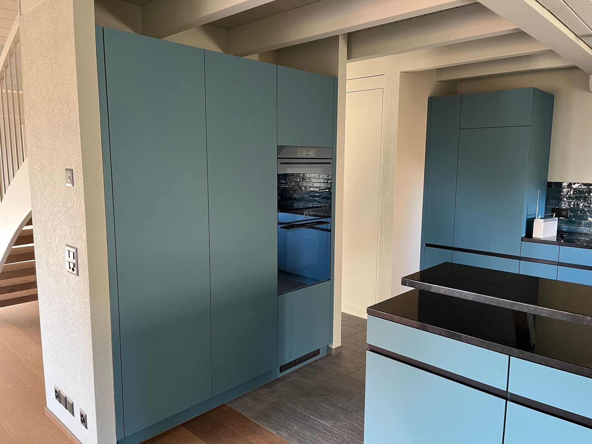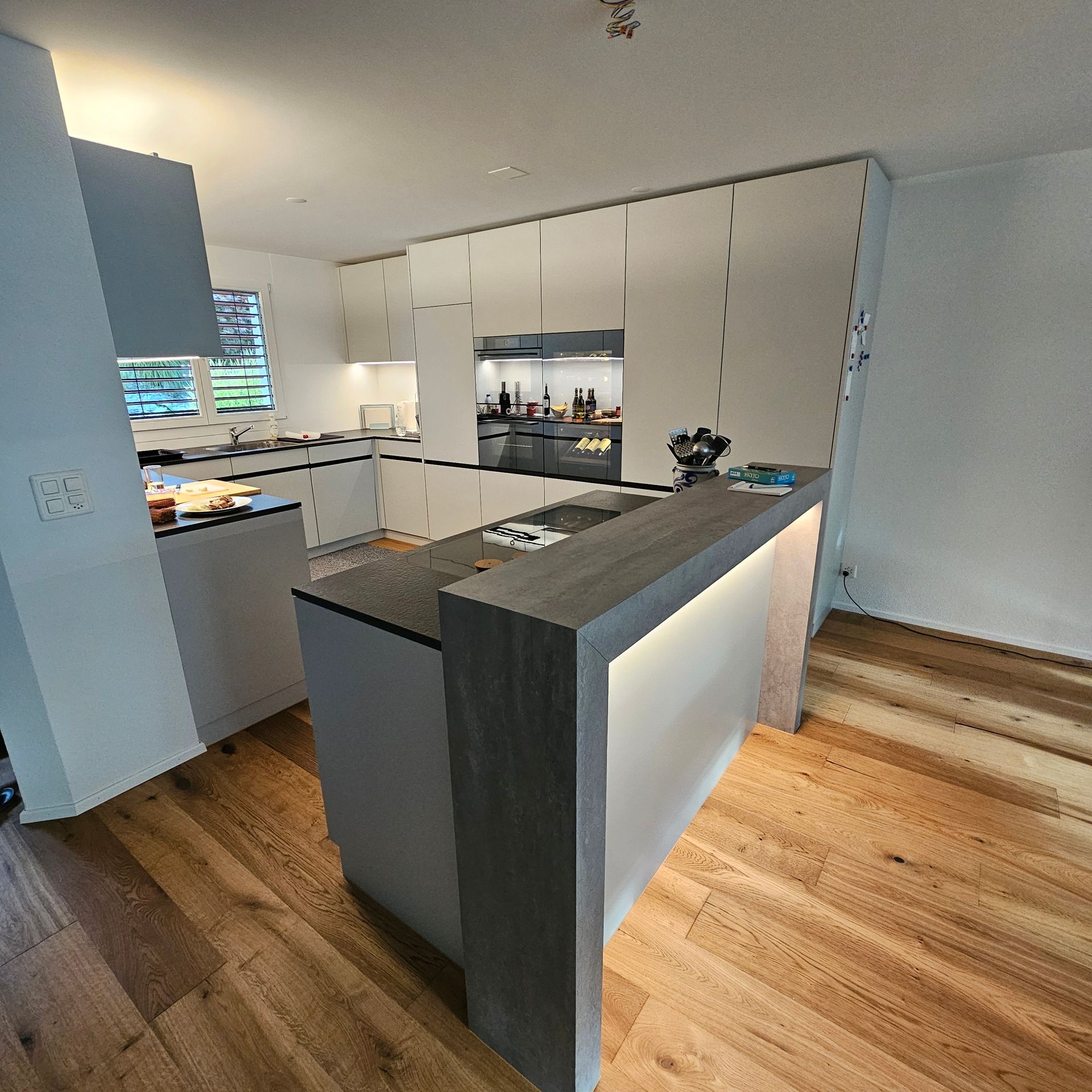 - Grosszügige Küchenmöblierung: Front bündige Griffprofile, zahlreiche Schubladen und Auszüge für maximalen Komfort.